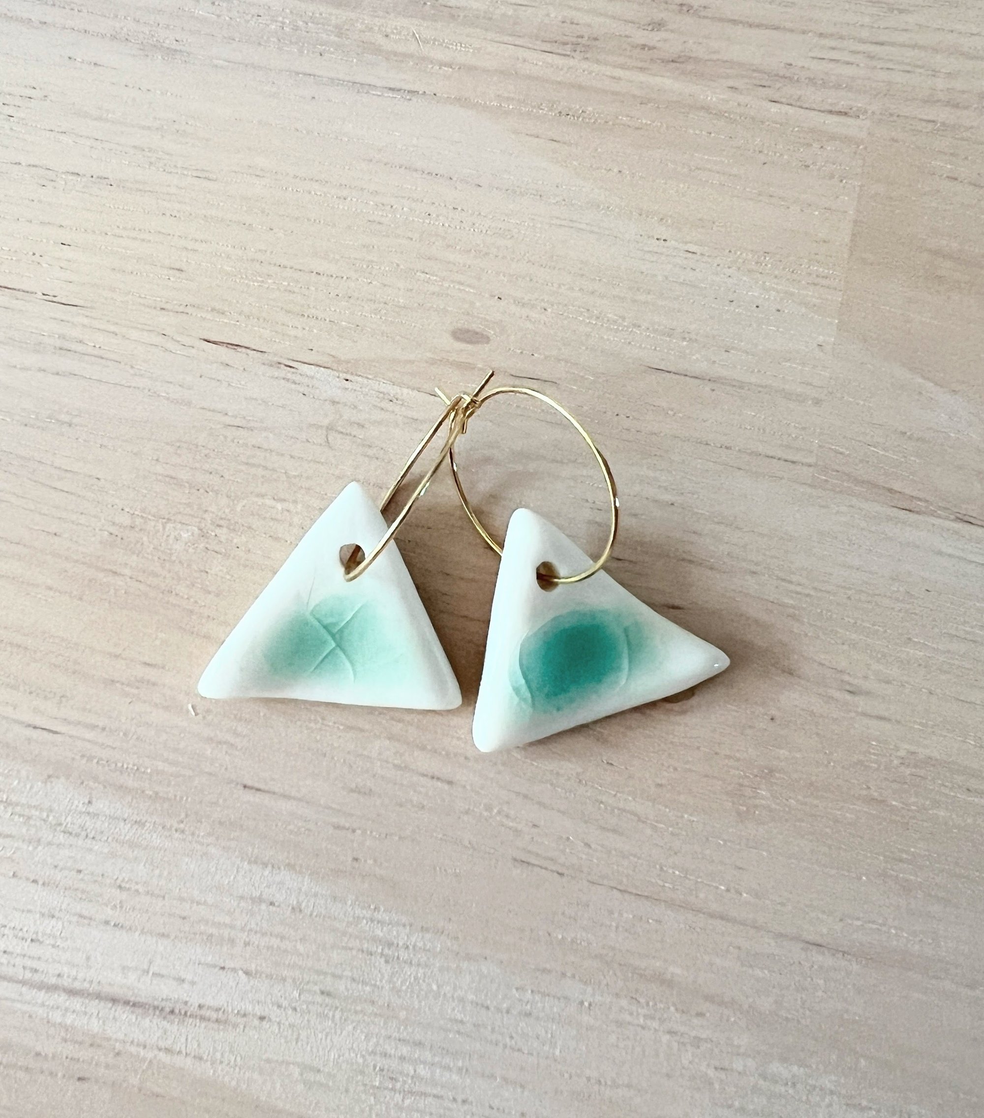 Belle paire de boucle d'oreilles en porcelaine, émail vert craquelé.Anneaux en acier inoxydable, diamètre 2 cm.Porcelain earrings, cracked green glaze.Stainless steel hoops, diameter 2 cm.