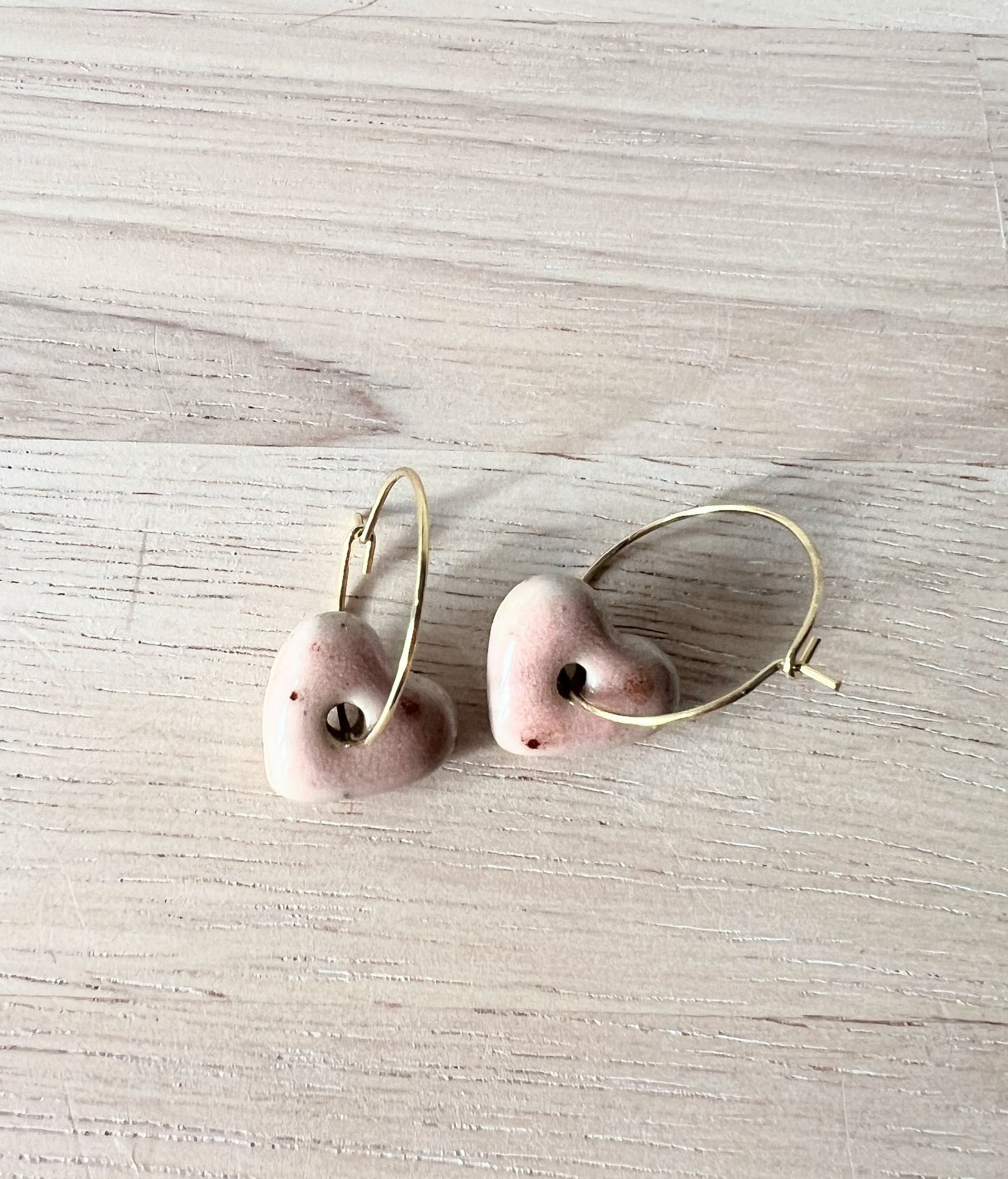 Belle paire de boucles d'oreille en grès, émail rose moucheté.Anneaux en acier inoxydable, diamètre 2 cm.Sandstone earrings, pyrite pink glaze.Stainless steel hoops, diameter 2 cm.