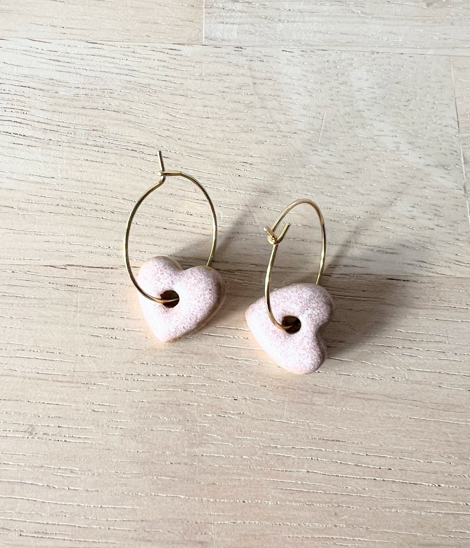 Belle paire de boucles d'oreilles en grès, rose mat.Anneaux en acier inoxydable, diamètre 2 cm.Sandstone earrings, mat pink glaze.Stainless steel hoops, diameter 2 cm.