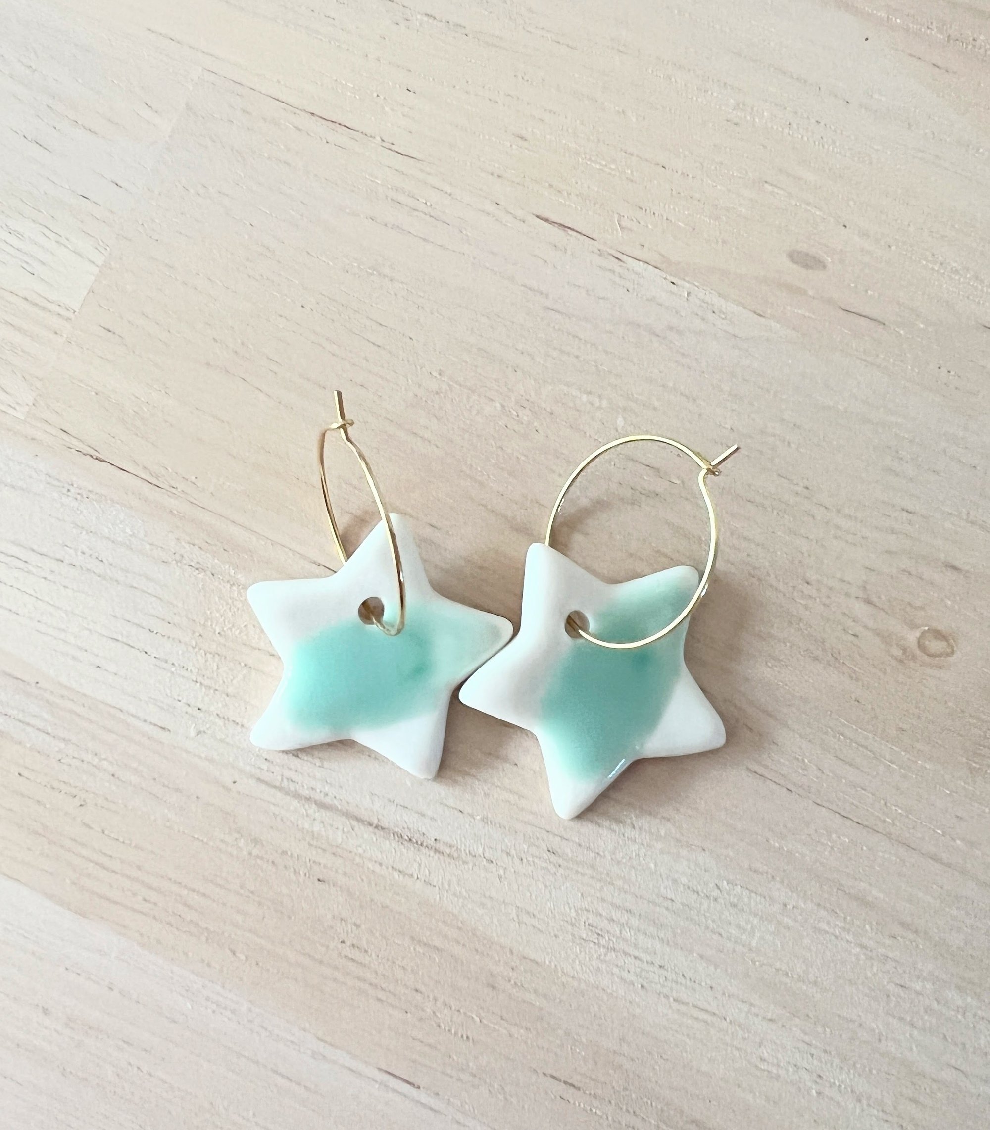 Belle paire de boucles d'oreilles en porcelaine, émail vert clair.Anneaux en acier inoxydable, diamètre 2 cm.Porcelain earrings, clear green glaze.Stainless steel hoops, diameter 2 cm.