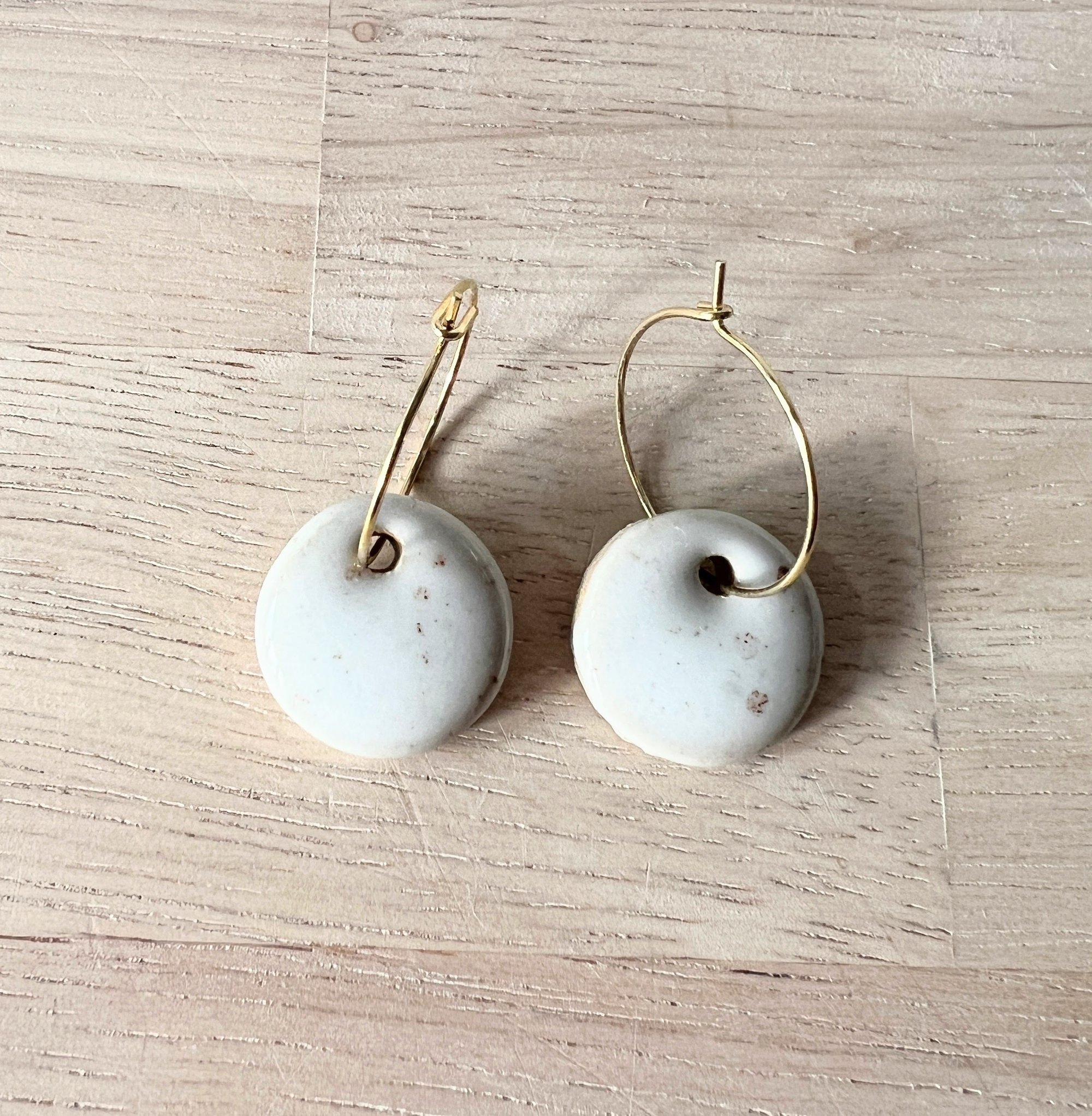 Belle paire de boucles d'oreille en grès, émail blanc moucheté.Anneaux en acier inoxydable, diamètre 2 cm.Sandstone earrings, whyte pyrite glaze.Stainless steel hoops, diameter 2 cm.